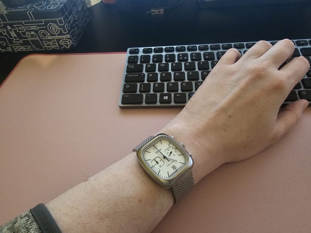 We then found this one. A milanese mesh bracelet from UK microbrand Geckota. We had been admiring their sexy looking Pioneer range for a while (especially in the Terminator Eye red colour) and they’ve got a square-ish aspect to them and sit beautifully on mesh bracelets. It also turns out that Geckota sell the bracelets. Neat. We then couldn’t decide between the Polished or Satin finishes and ended up buying both but expecting the Satin would be the better stylistic match in a Robotic Eye for the Human Guy sort of way.