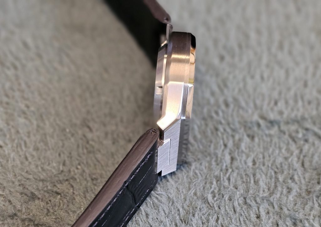 The visual appeal doesn’t stop there, though. As we said, there’s quite a lot going on with the case. The bezel sports a nice vertically-brushed polish and is split down the middle with an engraved line that follows the shape of the case. It can be a little bit of a dust-trap, but it looks great. This leads down to a high-polished edge which then sits on the larger body of the case which has differently-angled edges to its octaganal space and goes back to the previous vertical brushing. It’s something of a layer cake for the eyes, and we really are enjoying it.