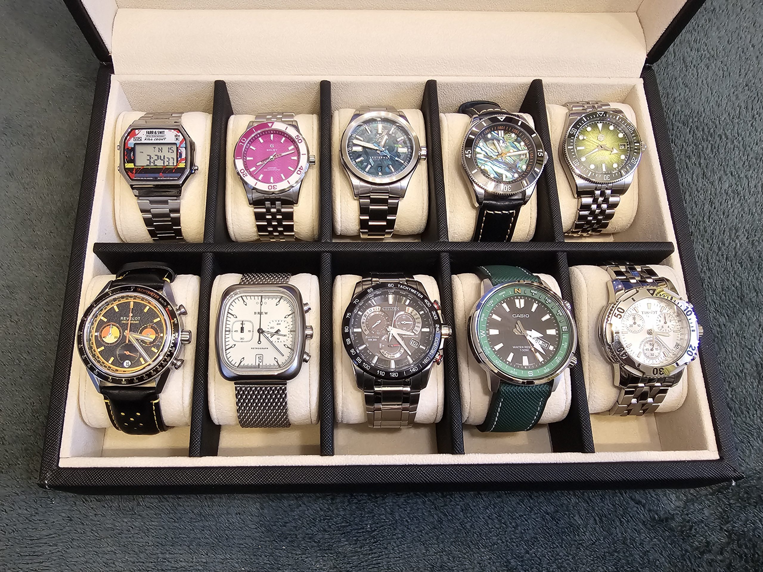 The ‘Ten Watch Box’ Verdict: But will the Kill Count be able to earn a place in our main watch box? Our feeble attempts to slim down from the ten-watch box to a six were a shambles. It’s just not doable, and right now the ten-watch collection is looking tasty. That said, it’s a tiny bit diver-heavy and so having a quirky digital watch like this serves a couple of functions. It’s just a perfect pick up and go watch, and we’re falling out of love with chronographs (they just look a bit dead when there isn’t a proper seconds hand), so this will be great in places where we need a stopwatch. Also, it breaks up the collection, adding a bit of fun and colour to the set. It’ll definitely be in the ten watch box for a while.