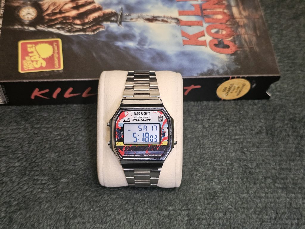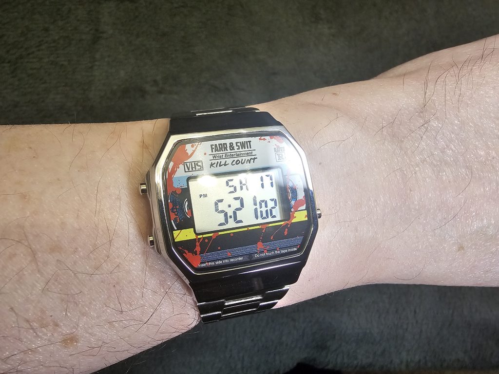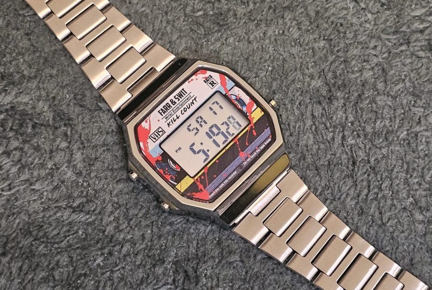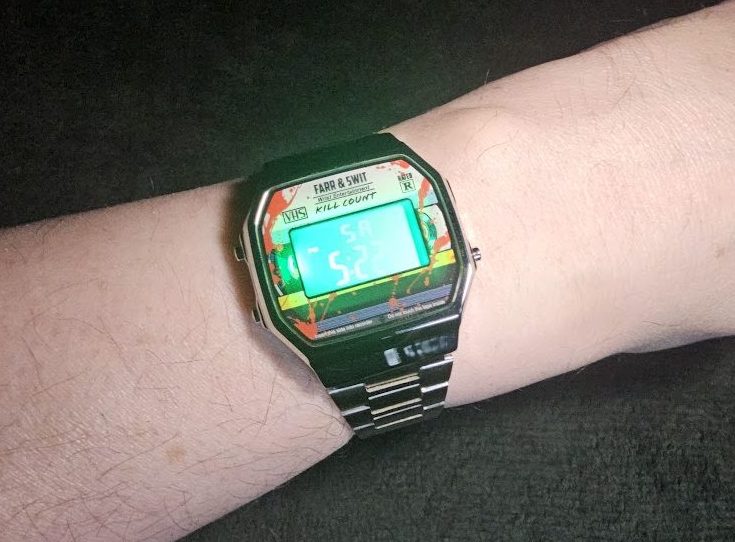 We unboxed it five days ago, and now that the VHS-style case is packed away with all the other watch packaging, all we’re left with is this small-but-joyous digital watch. It’s detailed, but it’s clean. The print is so sharp, the colours contrast brilliantly and, as a watch, it just works. It speaks to us as forever-members of the ’80s Movie Club, and it’s so much more interesting than most of the vintage-style Casio digitals out there, although probably not as versatile. We absolutely love it. The shape, the look. It’s just so on point for what the watch is trying to do. And it’s the F-91W for people like us. Children of the ’80s, traumatised far too young by our first viewing of The Evil Dead and now trying to hold it together in an office with people who’d be the first ones to fall over and run into dead-ends like idiots when being chased by Jason Vorhees.