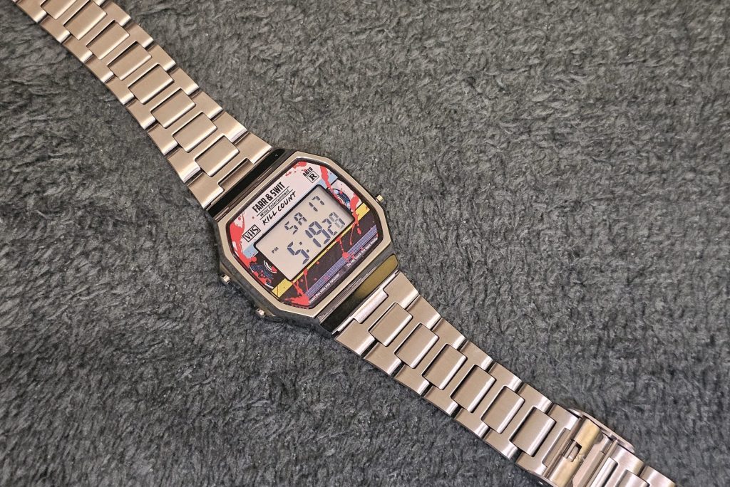 Unlike the Retro Mixtape series, which was all-plastic, this all sits on a polished stainless steel case. Take away the blood and madness of it all, and the F-91W comparisons would be pretty valid. The dimensions are very close indeed. The Kill Count measures 35mm in diameter (38mm lug to lug) and 11mm thick. Comparatively, the F-91W comes in at practically the same size, albeit thinner at just 8.5mm (but of course, it’s primarily made of plastic).
