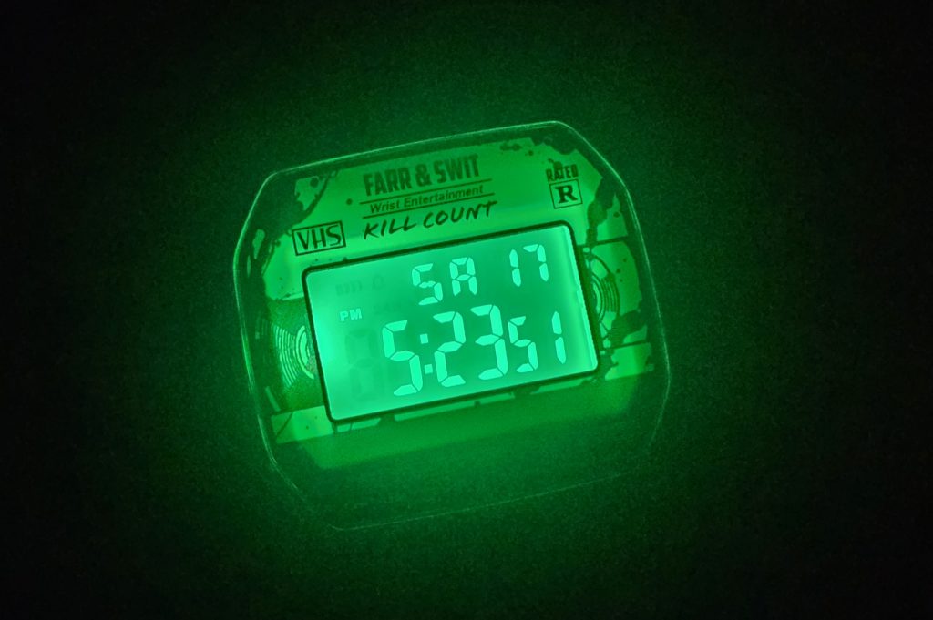In terms of the functionality of the watch, the Kill Count offers up a traditional three-button layout, which drives the operation of the digital module. It isn’t identified but is presumably just a cheap, generic one. It all works nicely, though. The top-left button activates the LED backlight, which is actually surprisingly effective. We keep comparing everything to the Casio, and this is another area where the Kill Count shines, literally. Instead of a dim, side-mounted diode trying to light up the display from an angle, the Kill Count’s backlight lights up everything. Presumably some sort of electroluminescent affair, this bathes the whole display in a radioactive green, inverting the LCD digits while shining through some of that on-glass printing. It feels personal to me too, as it reminds me of the decaying aliens in the trunk of the car in Repo Man, my favourite ever film and a true VHS classic.